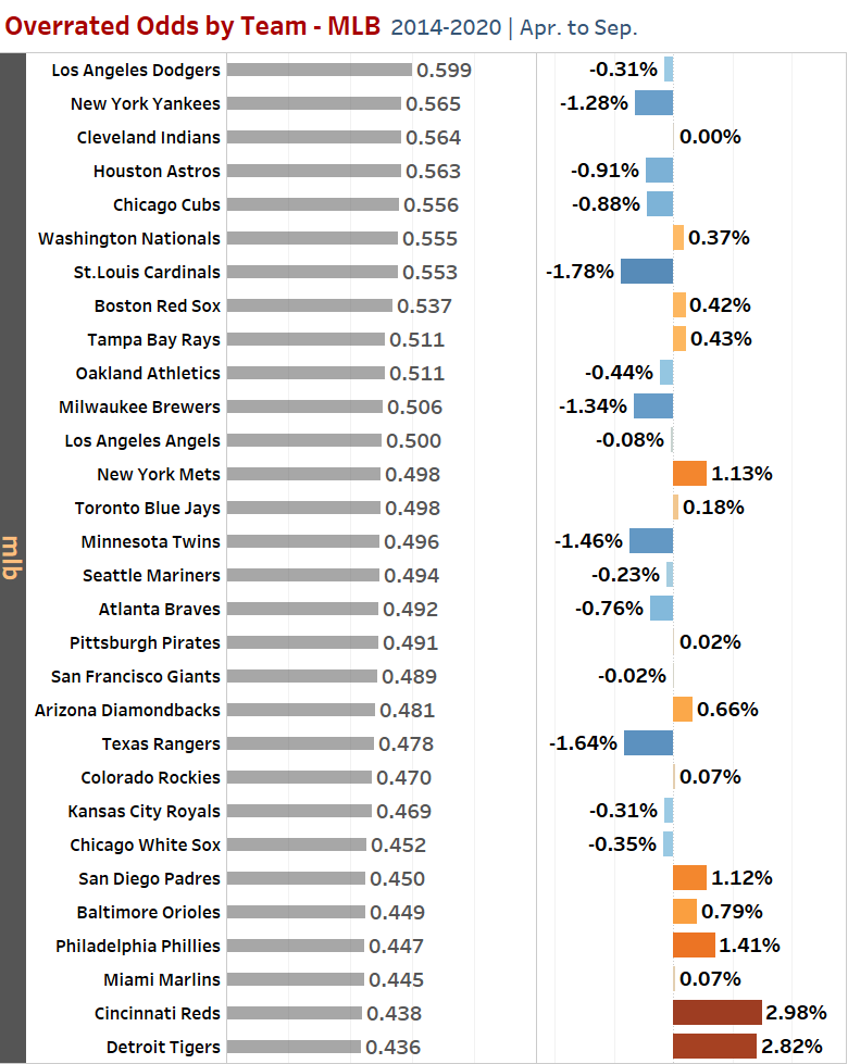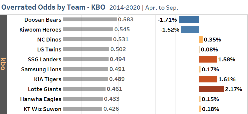 보시다시피 일단 kbo리그를 기준한다면, 상위팀은 과소평가되었고 하위팀이 과대평가되는 경향이 관찰됩니다. 두산베어스와 키움히어로즈는 실제 승률에 비해 도박사의 배당률이 과소평가되었습니다. 기간 중 배당률이 가장 과대평가된 팀은 롯데자이언츠입니다. 의미는, 두산베어스나 키움히어로즈 승리에 베팅했을 경우 상대적으로 유리했을 것이며, 롯데자이언츠나 기아타이거즈에 베팅했다면 상대적으로 불리했다는 것입니다. 더 간단하게 말한다면 --- 역배당은 가급적 피해라.가 될려나요.