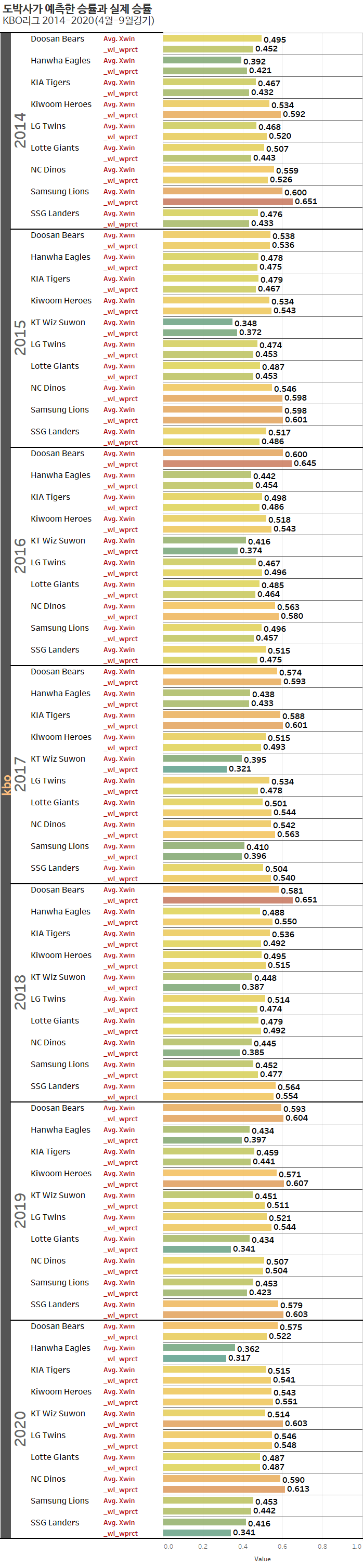 다음 차트는 kbo리그 2014년부터 2020년까지 팀별 전체승률과 도박사들이 예측한 승률의 비교입니다. 오른쪽 0.0%p를 중심으로 좌우로 갈라진 bar가 실제승률 대비 도박사가 과대평가했거나 과소평가한 정보를 표시합니다.