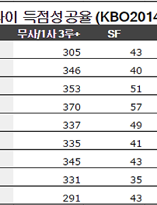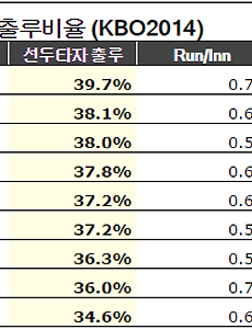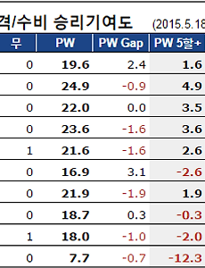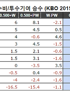 2015년 5월18일 기준 순위표의 제일 위에는 두산이 있고 끝에는 kt가 있습니다.10개팀의 타격, 수비, 주루 부문별 밸런스 및 현재까지의 팀득점 및 실점에 대한 기여도 분석입니다. 피타고리안 승률 계산방법을 이용해서, 기대승수의 5할+ 부분의 기여도를 공격력과 수비/투수력의 몫으로 구분합니다. 계산방법은 팀 기대승률 계산식인 득점^2 / (득점^2 + 실점^2) 중 공격기여승률의 경우는 실점 팩터 위치에 리그평균수준 실점을, 수비기여승률의 경우 득점팩터 위치에 리그평균수준 득점을 대입하면 됩니다. 즉, 득점 또는 실점이 리그평균수준일 때, 나머지 팩터에 의해 만들어진 [기대승수]의 크기를 계산하는 방법입니다. 두산과 넥센, 롯데는 수비/투수에 비해 공격력이 상대적 우위이고, 기아, 엘지트윈스는 반대..